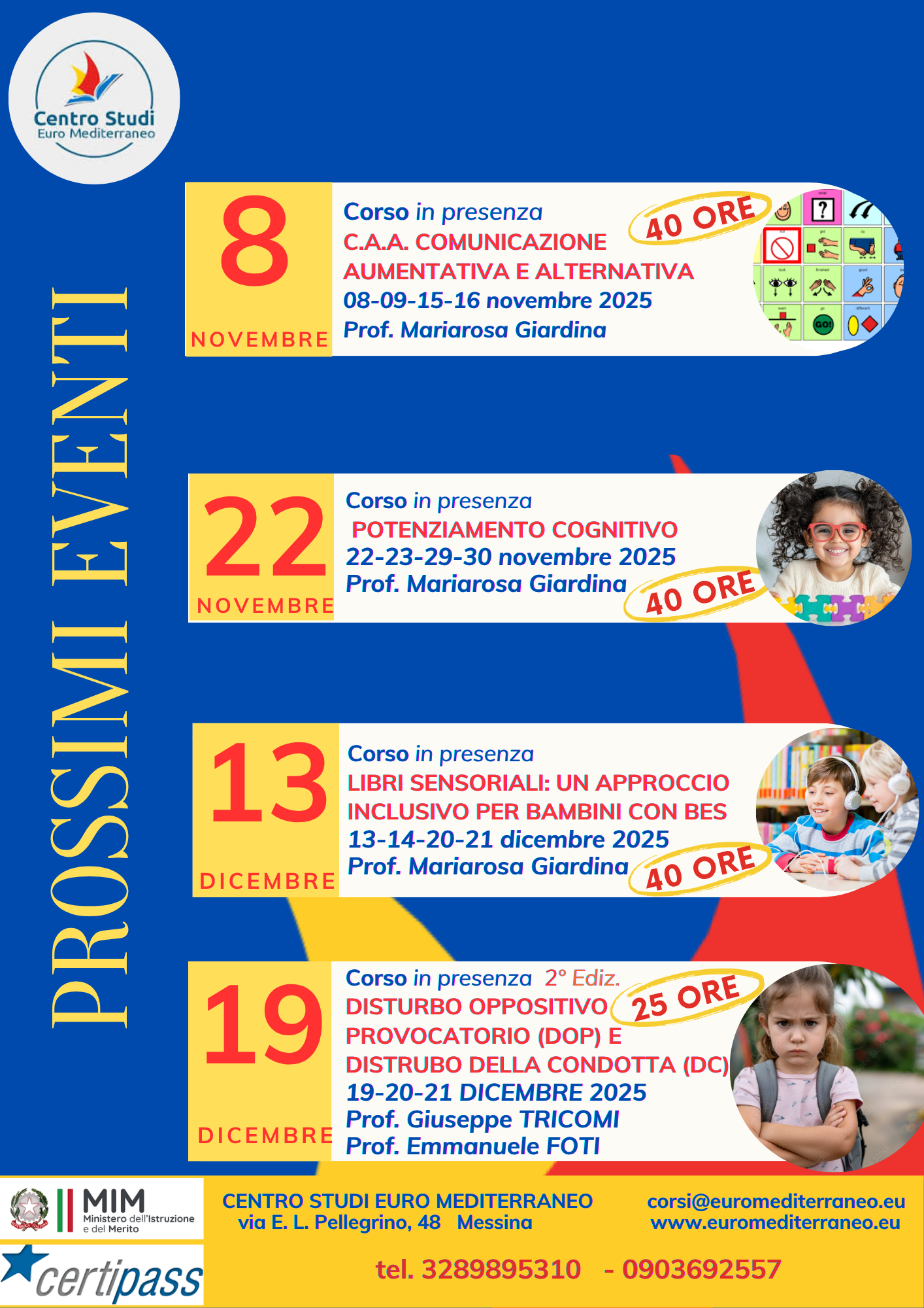 Il Centro Studi Euro Mediterraneo offre una gamma diversificata di corsi di formazione, progettati per potenziare le competenze professionali dei partecipanti. Attraverso incontri e percorsi formativi, il centro si impegna a fornire un'istruzione di alta qualità, mirata a soddisfare le esigenze del mercato attuale.